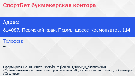 СпортБет, букмекерская контора по адресу 614087, Пермский край, Пермь, шоссе Космонавтов, 114 в дальнейшем Организация, размещена в следующих категориях: