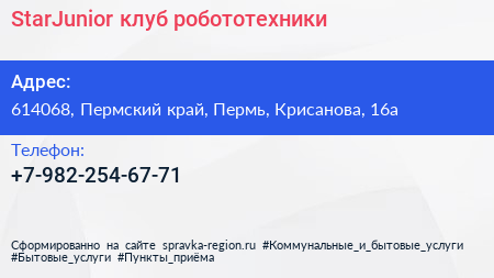 StarJunior, клуб робототехники по адресу 614068, Пермский край, Пермь, Крисанова, 16а в дальнейшем Организация, размещена в следующих категориях: