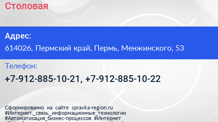Столовая по адресу 614026, Пермский край, Пермь, Менжинского, 53 в дальнейшем Организация, размещена в следующих категориях: