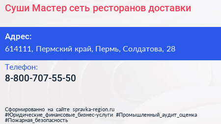 Суши Мастер, сеть ресторанов доставки по адресу 614111, Пермский край, Пермь, Солдатова, 28 в дальнейшем Организация, размещена в следующих категориях: