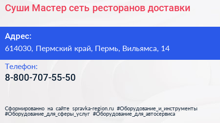 Суши Мастер, сеть ресторанов доставки по адресу 614030, Пермский край, Пермь, Вильямса, 14 в дальнейшем Организация, размещена в следующих категориях: