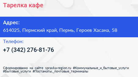 Тарелка, кафе по адресу 614025, Пермский край, Пермь, Героев Хасана, 58 в дальнейшем Организация, размещена в следующих категориях: