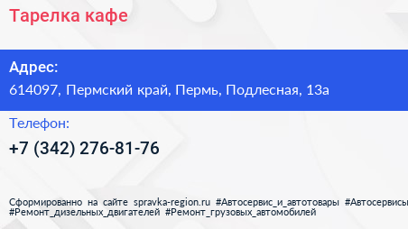 Тарелка, кафе по адресу 614097, Пермский край, Пермь, Подлесная, 13а в дальнейшем Организация, размещена в следующих категориях: