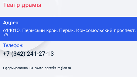 Театр драмы по адресу 614010, Пермский край, Пермь, Комсомольский проспект, 79 в дальнейшем Организация, размещена в следующих категориях: