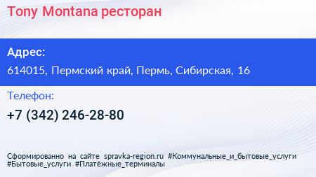 Tony Montana, ресторан по адресу 614015, Пермский край, Пермь, Сибирская, 16 в дальнейшем Организация, размещена в следующих категориях: