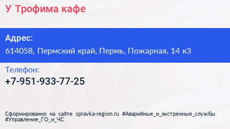 У Трофима, кафе по адресу 614058, Пермский край, Пермь, Пожарная, 14 к3 в дальнейшем Организация, размещена в следующих категориях:
