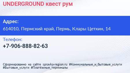 UNDERGROUND, квест-рум по адресу 614010, Пермский край, Пермь, Клары Цеткин, 14 в дальнейшем Организация, размещена в следующих категориях: