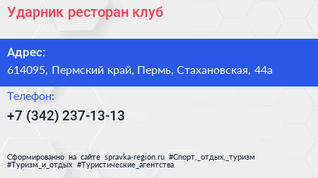 Ударник, ресторан-клуб по адресу 614095, Пермский край, Пермь, Стахановская, 44а в дальнейшем Организация, размещена в следующих категориях: