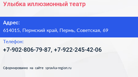 Улыбка, иллюзионный театр по адресу 614015, Пермский край, Пермь, Советская, 69 в дальнейшем Организация, размещена в следующих категориях:
