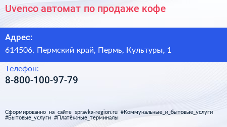 Uvenco, автомат по продаже кофе по адресу 614506, Пермский край, Пермь, Культуры, 1 в дальнейшем Организация, размещена в следующих категориях: