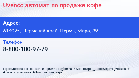 Uvenco, автомат по продаже кофе по адресу 614095, Пермский край, Пермь, Мира, 39 в дальнейшем Организация, размещена в следующих категориях: