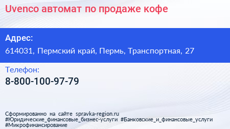 Uvenco, автомат по продаже кофе по адресу 614031, Пермский край, Пермь, Транспортная, 27 в дальнейшем Организация, размещена в следующих категориях: