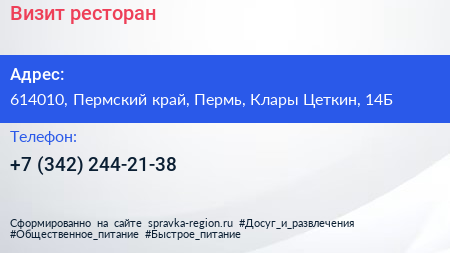 Для связи с организацией воспользуйтесь номером телефона: +7 (342) 244-21-38. Пн: c 07:30-22:30, Вт: c 07:30-22:30, Ср: c 07:30-22:30, Чт: c 07:30-22:30, Пт: c 07:30-22:30, Сб: c 08:00-22:30, Вс: c 09:00-22:30, вы можете обратиться в эту организацию.