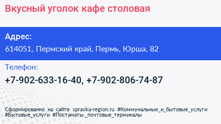 Вкусный уголок, кафе-столовая по адресу 614051, Пермский край, Пермь, Юрша, 82 в дальнейшем Организация, размещена в следующих категориях: