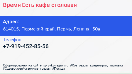 Время Есть, кафе-столовая по адресу 614015, Пермский край, Пермь, Ленина, 50а в дальнейшем Организация, размещена в следующих категориях: