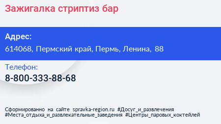 Зажигалка, стриптиз-бар по адресу 614068, Пермский край, Пермь, Ленина, 88 в дальнейшем Организация, размещена в следующих категориях: