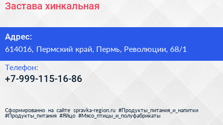 Застава, хинкальная по адресу 614016, Пермский край, Пермь, Революции, 68/1 в дальнейшем Организация, размещена в следующих категориях: