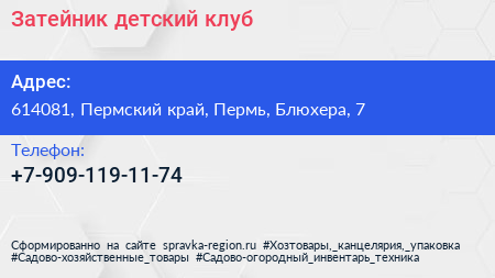 Затейник, детский клуб по адресу 614081, Пермский край, Пермь, Блюхера, 7 в дальнейшем Организация, размещена в следующих категориях: