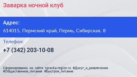 Заварка, ночной клуб по адресу 614015, Пермский край, Пермь, Сибирская, 8 в дальнейшем Организация, размещена в следующих категориях: