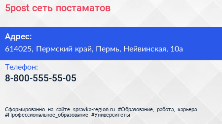 5post, сеть постаматов по адресу 614025, Пермский край, Пермь, Нейвинская, 10а в дальнейшем Организация, размещена в следующих категориях: