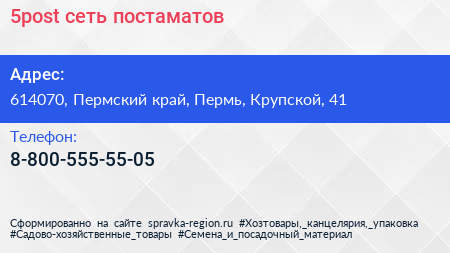 5post, сеть постаматов по адресу 614070, Пермский край, Пермь, Крупской, 41 в дальнейшем Организация, размещена в следующих категориях: