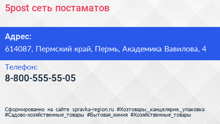 5post, сеть постаматов по адресу 614087, Пермский край, Пермь, Академика Вавилова, 4 в дальнейшем Организация, размещена в следующих категориях: