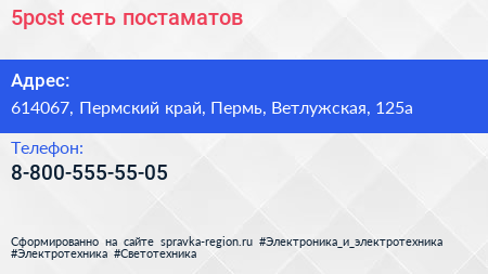 5post, сеть постаматов по адресу 614067, Пермский край, Пермь, Ветлужская, 125а в дальнейшем Организация, размещена в следующих категориях:
