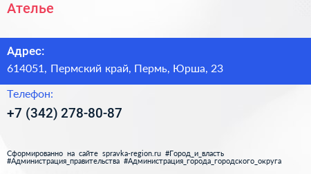 Ателье по адресу 614051, Пермский край, Пермь, Юрша, 23 в дальнейшем Организация, размещена в следующих категориях: