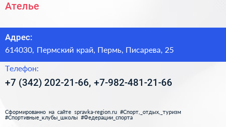 Ателье по адресу 614030, Пермский край, Пермь, Писарева, 25 в дальнейшем Организация, размещена в следующих категориях:
