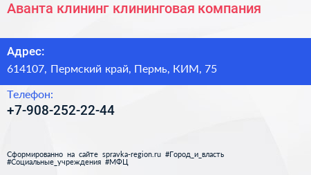 Аванта клининг, клининговая компания по адресу 614107, Пермский край, Пермь, КИМ, 75 в дальнейшем Организация, размещена в следующих категориях: