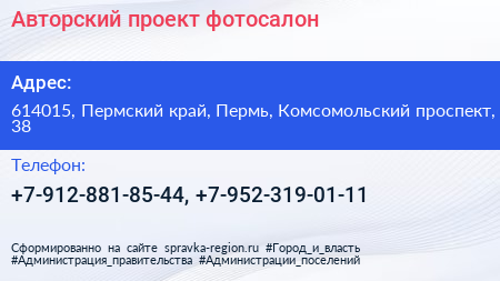 Авторский проект, фотосалон по адресу 614015, Пермский край, Пермь, Комсомольский проспект, 38 в дальнейшем Организация, размещена в следующих категориях: