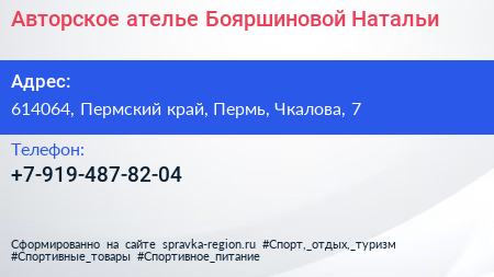 Авторское ателье Бояршиновой Натальи по адресу 614064, Пермский край, Пермь, Чкалова, 7 в дальнейшем Организация, размещена в следующих категориях:
