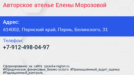 Авторское ателье Елены Морозовой по адресу 614002, Пермский край, Пермь, Белинского, 31 в дальнейшем Организация, размещена в следующих категориях: