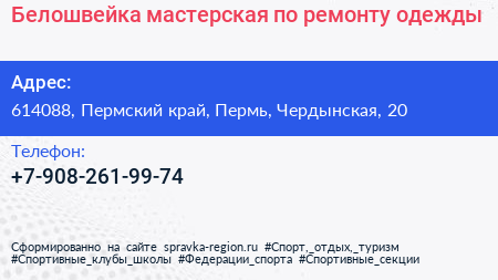 Белошвейка, мастерская по ремонту одежды по адресу 614088, Пермский край, Пермь, Чердынская, 20 в дальнейшем Организация, размещена в следующих категориях: