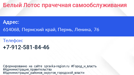 Белый Лотос, прачечная самообслуживания по адресу 614068, Пермский край, Пермь, Ленина, 76 в дальнейшем Организация, размещена в следующих категориях: