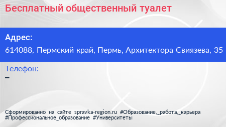 Бесплатный общественный туалет по адресу 614088, Пермский край, Пермь, Архитектора Свиязева, 35 в дальнейшем Организация, размещена в следующих категориях: