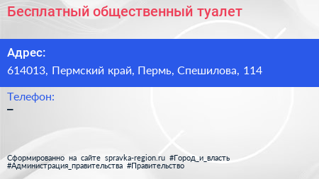 Бесплатный общественный туалет по адресу 614013, Пермский край, Пермь, Спешилова, 114 в дальнейшем Организация, размещена в следующих категориях: