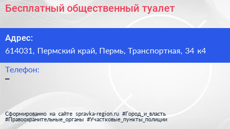 Бесплатный общественный туалет по адресу 614031, Пермский край, Пермь, Транспортная, 34 к4 в дальнейшем Организация, размещена в следующих категориях:
