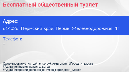 Бесплатный общественный туалет по адресу 614026, Пермский край, Пермь, Железнодорожная, 1г в дальнейшем Организация, размещена в следующих категориях: