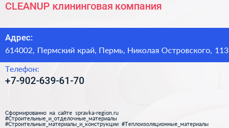 CLEANUP, клининговая компания по адресу 614002, Пермский край, Пермь, Николая Островского, 113 в дальнейшем Организация, размещена в следующих категориях: