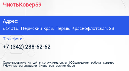 ЧистьКовер59 по адресу 614016, Пермский край, Пермь, Краснофлотская, 28 в дальнейшем Организация, размещена в следующих категориях: