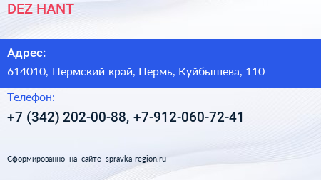 DEZ-HANT по адресу 614010, Пермский край, Пермь, Куйбышева, 110 в дальнейшем Организация, размещена в следующих категориях: