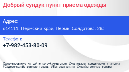 Добрый сундук, пункт приема одежды по адресу 614111, Пермский край, Пермь, Солдатова, 28а в дальнейшем Организация, размещена в следующих категориях: