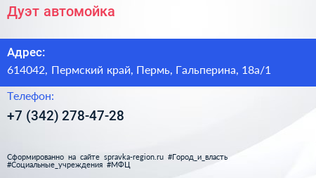 Дуэт, автомойка по адресу 614042, Пермский край, Пермь, Гальперина, 18а/1 в дальнейшем Организация, размещена в следующих категориях: