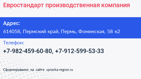 Евростандарт, производственная компания по адресу 614058, Пермский край, Пермь, Фоминская, 58 к2 в дальнейшем Организация, размещена в следующих категориях: