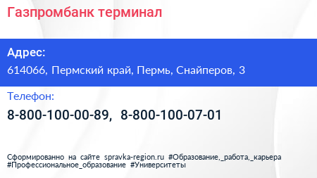 Газпромбанк, терминал по адресу 614066, Пермский край, Пермь, Снайперов, 3 в дальнейшем Организация, размещена в следующих категориях: