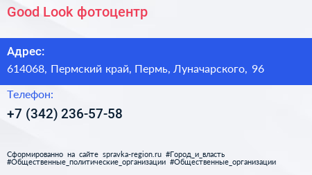 Good Look, фотоцентр по адресу 614068, Пермский край, Пермь, Луначарского, 96 в дальнейшем Организация, размещена в следующих категориях: