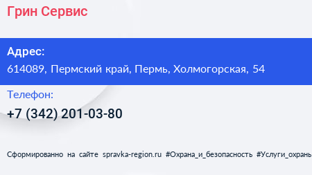 Грин Сервис по адресу 614089, Пермский край, Пермь, Холмогорская, 54 в дальнейшем Организация, размещена в следующих категориях: