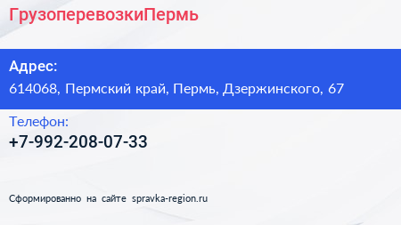 ГрузоперевозкиПермь по адресу 614068, Пермский край, Пермь, Дзержинского, 67 в дальнейшем Организация, размещена в следующих категориях: