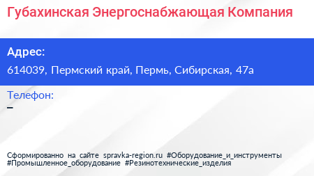 Губахинская Энергоснабжающая Компания по адресу 614039, Пермский край, Пермь, Сибирская, 47а в дальнейшем Организация, размещена в следующих категориях: